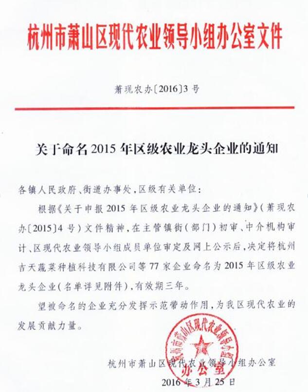 2016年4月20日展旺(杭州)食品有限公司荣获区级农业龙头企业。杭州市萧山区现代农业领导小组办公室领导莅临颁奖仪式。总经理黄世宗接受证书并合影留念。